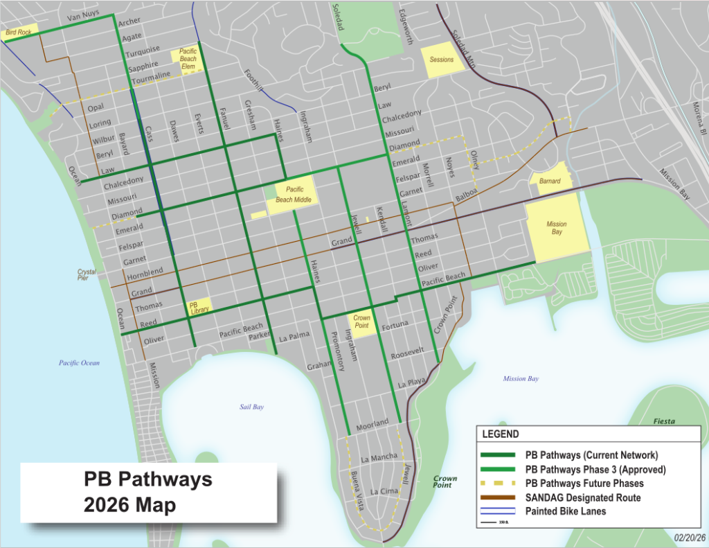 PB Pathways is a network of streets in Pacific Beach identified as routes with lower vehicle traffic that are more suitable for active mobility than other streets in the community. These pathways support safe and comfortable local travel by all modes — walking, biking, driving, scooting, and more. Adoption of the PB Pathways network lays the groundwork for future traffic calming and mobility enhancements along these routes in Pacific Beach, San Diego.